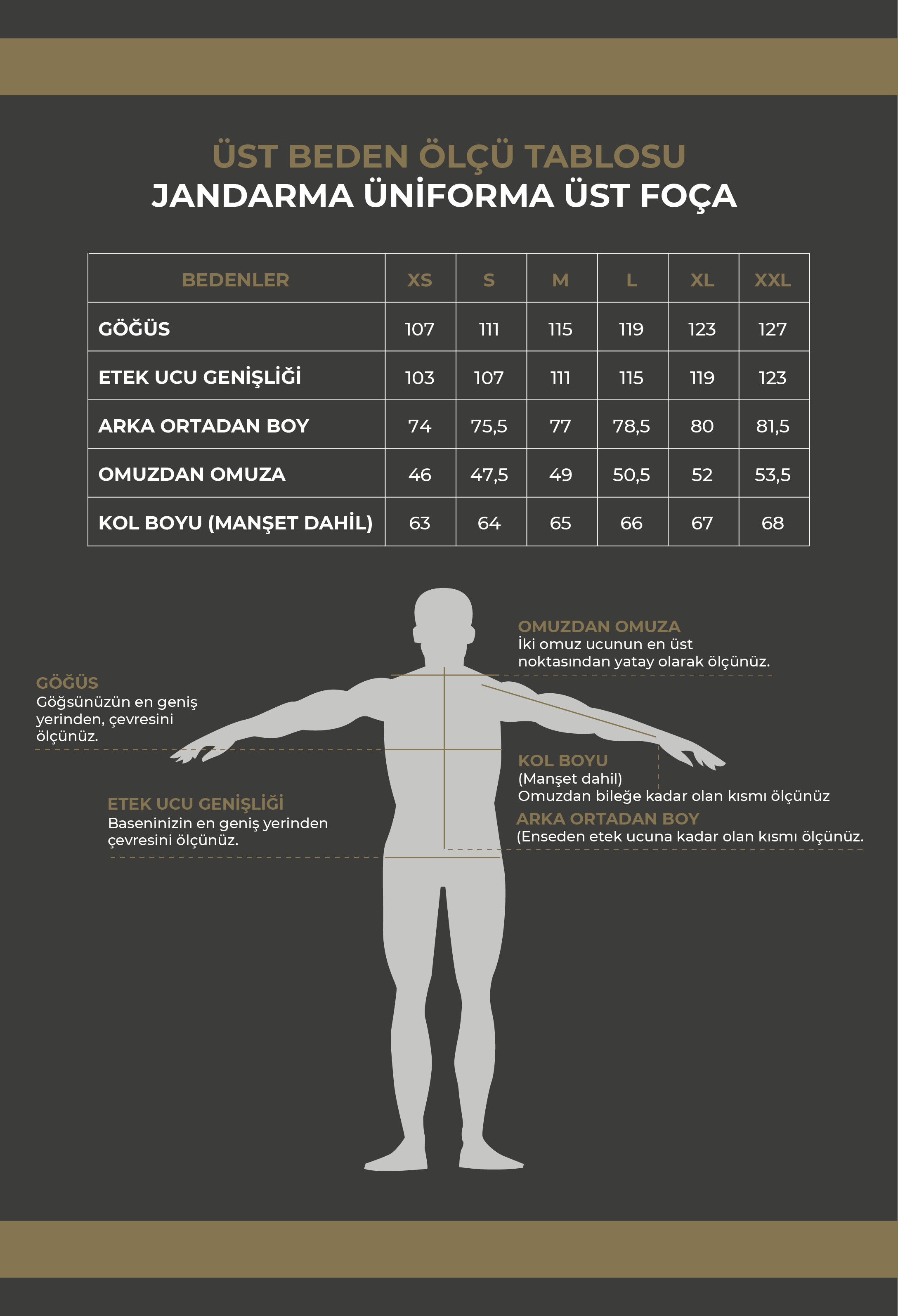 Jandarma komando üniforma üst Foça, yoğun kullanım için geliştirilmiştir. Anafarta patentli MUKAN taktik ripstop kumaş, sürtünme ve yırtılmaya karşı yüksek dayanım sunar. Su ve yağ itici apre kaplama çevresel etkilere karşı ek koruma sağlar. Yüksek teknoloji boyama yöntemi uzun süreli renk stabilitesi sunar.
